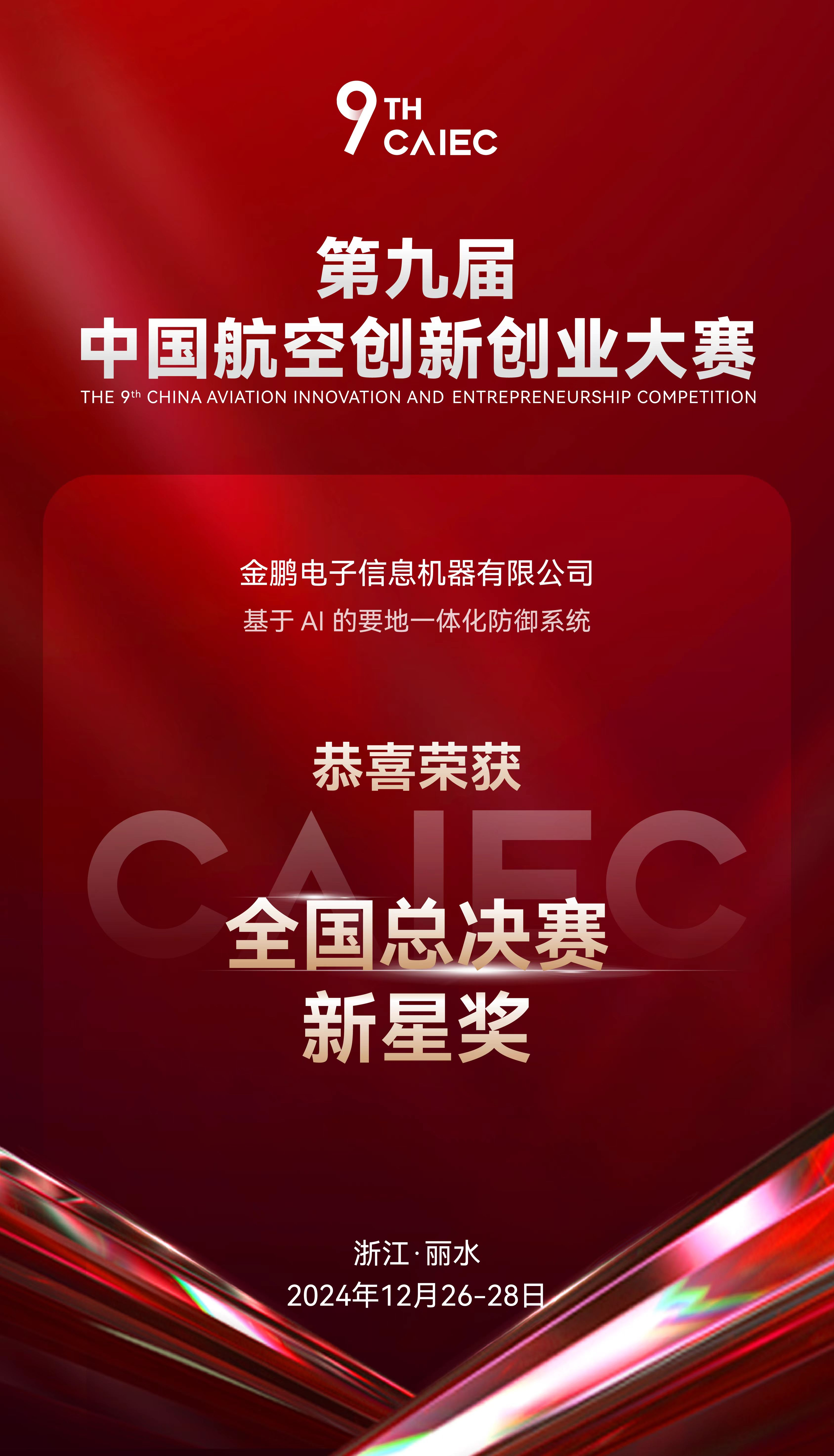 2024年12月28日,第九屆中國(guó)航空創(chuàng)新創(chuàng)業(yè)大賽圓滿落幕。 金鵬電子信息機(jī)器有限公司攜在低空安全領(lǐng)域全新打造的產(chǎn)品《基于AI 的要地一體化防御系統(tǒng)》首次亮相本次大賽,并一舉榮獲創(chuàng)新組新星獎(jiǎng)。