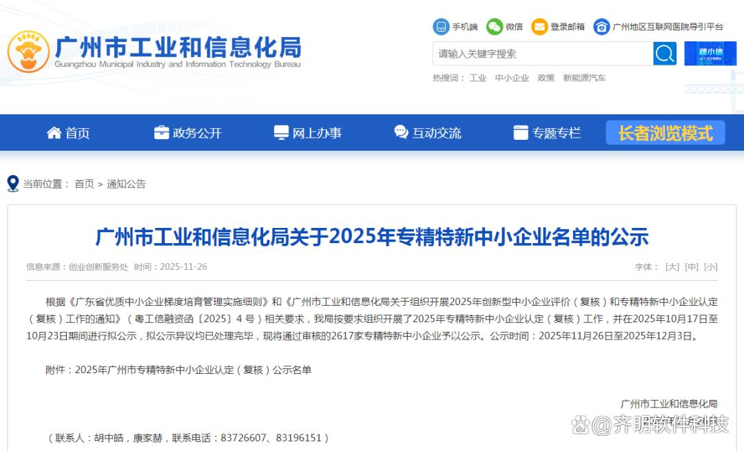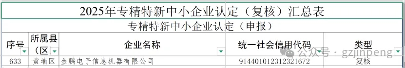 這一認定是對金鵬電子多年來堅持“專業(yè)化、精細化、特色化、新穎化”發(fā)展道路的充分肯定。作為一家成立30年的高新技術(shù)企業(yè),金鵬自成立之初就把“創(chuàng)新、超卓、突破、引領(lǐng)”作為企業(yè)文化精神,金鵬始終通過持續(xù)的技術(shù)創(chuàng)新、管理創(chuàng)新和服務(wù)創(chuàng)新,不斷超越自我,引領(lǐng)市場,連續(xù)多年研發(fā)經(jīng)費投入超千萬元,金鵬電子是廣東省首批獲得國家高新技術(shù)企業(yè)稱號,并連續(xù)16年保持該榮譽的企業(yè)。同時金鵬還獲得廣州市創(chuàng)新標桿企業(yè)、廣東省創(chuàng)新型中小企業(yè)、廣州市人工智能企業(yè)、廣州黃埔區(qū)&廣州開發(fā)區(qū)信息技術(shù)應(yīng)用創(chuàng)新企業(yè)等榮譽稱號。多年來,公司始終將技術(shù)創(chuàng)新嵌入發(fā)展基因,近年來聚焦智慧城市安全、智慧城市應(yīng)急、智慧低空安全等細分賽道,深耕公安、城管、交通、電力、醫(yī)療等行業(yè)應(yīng)用場景,先后攻克推出了一系列具有自主知識產(chǎn)權(quán)的特色產(chǎn)品。此次復(fù)核通過,不僅是對公司過往“專精特新”實踐的權(quán)威背書,更為公司后續(xù)發(fā)展注入了政策動力。展望未來,金鵬電子將以此次復(fù)核通過為新起點,繼續(xù)深化“專精特新”發(fā)展理念,重點布局人工智能、邊緣計算、物聯(lián)網(wǎng)感知等前沿技術(shù),推動產(chǎn)品向高端化、智能化、定制化升級。‘專精特新’不是終點,而是公司持續(xù)發(fā)展的方向。未來金鵬將繼續(xù)聚焦核心業(yè)務(wù),深耕特色領(lǐng)域,用技術(shù)創(chuàng)新驅(qū)動企業(yè)發(fā)展,為廣東省‘專精特新’企業(yè)群體的壯大貢獻自己的力量,為推動行業(yè)數(shù)字化轉(zhuǎn)型提供更多‘金鵬方案’。”公示了2025年專精特新中小企業(yè)認定(復(fù)核)通過企業(yè)名單。經(jīng)過專家嚴格評審和綜合評估,金鵬電子信息機器有限公司順利通過2025年度復(fù)核,再度榮獲
