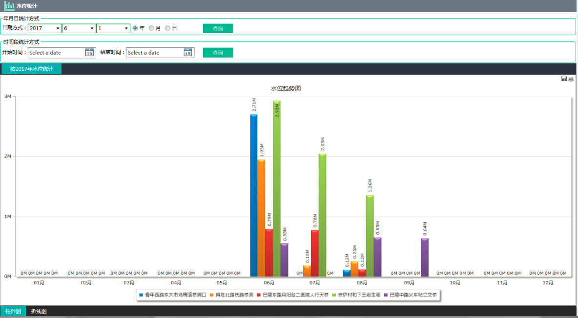 平臺(tái)提供多條件組合、多維度的智能分析功能,將各個(gè)監(jiān)測點(diǎn)的多個(gè)時(shí)間段水位監(jiān)測信息、重點(diǎn)部位的水位監(jiān)測信息、特殊天氣的水位監(jiān)測信息、預(yù)警信息、平臺(tái)推送信息進(jìn)行智能組合分析。為領(lǐng)導(dǎo)部署工作提供支持。