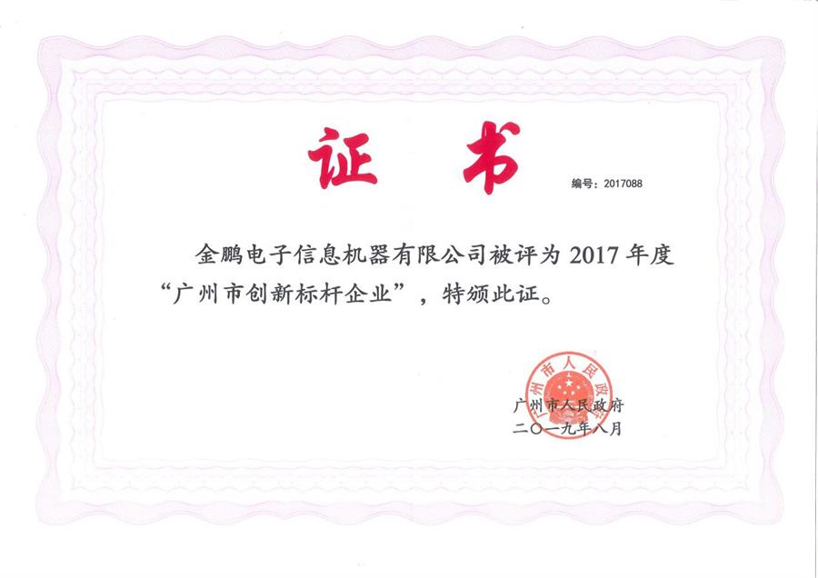 近日,金鵬電子信息機(jī)器有限公司憑借創(chuàng)造性的商業(yè)理念、強(qiáng)有力的技術(shù)創(chuàng)新能力,以及商業(yè)模式、組織模式、管理模式、服務(wù)模式等方面取得的突破性創(chuàng)新,經(jīng)過網(wǎng)上評審、要件審查、專家現(xiàn)場答辯考察等一系列環(huán)節(jié)后被廣州市人民政府授予“廣州市創(chuàng)新標(biāo)桿企業(yè)”稱號。